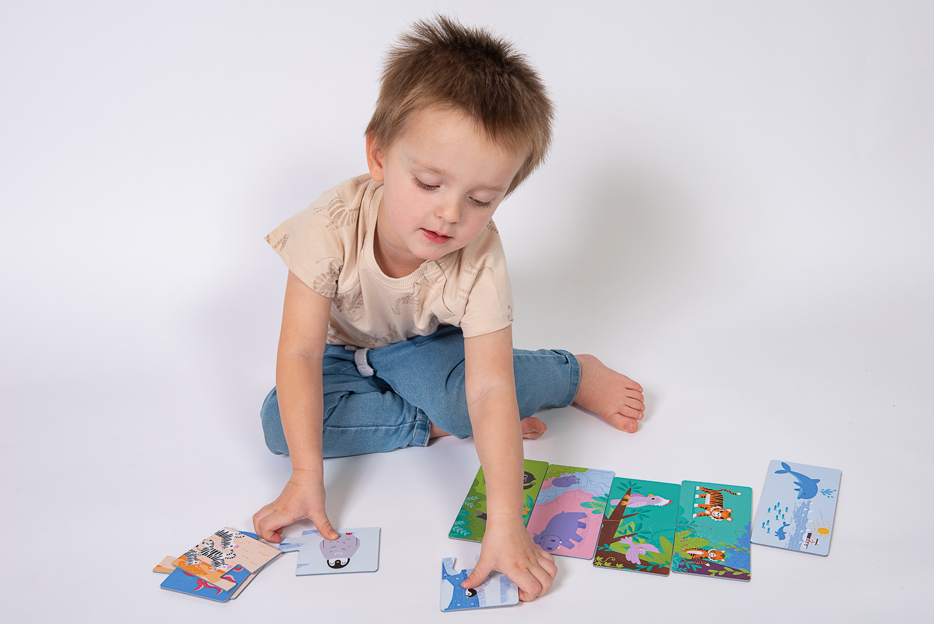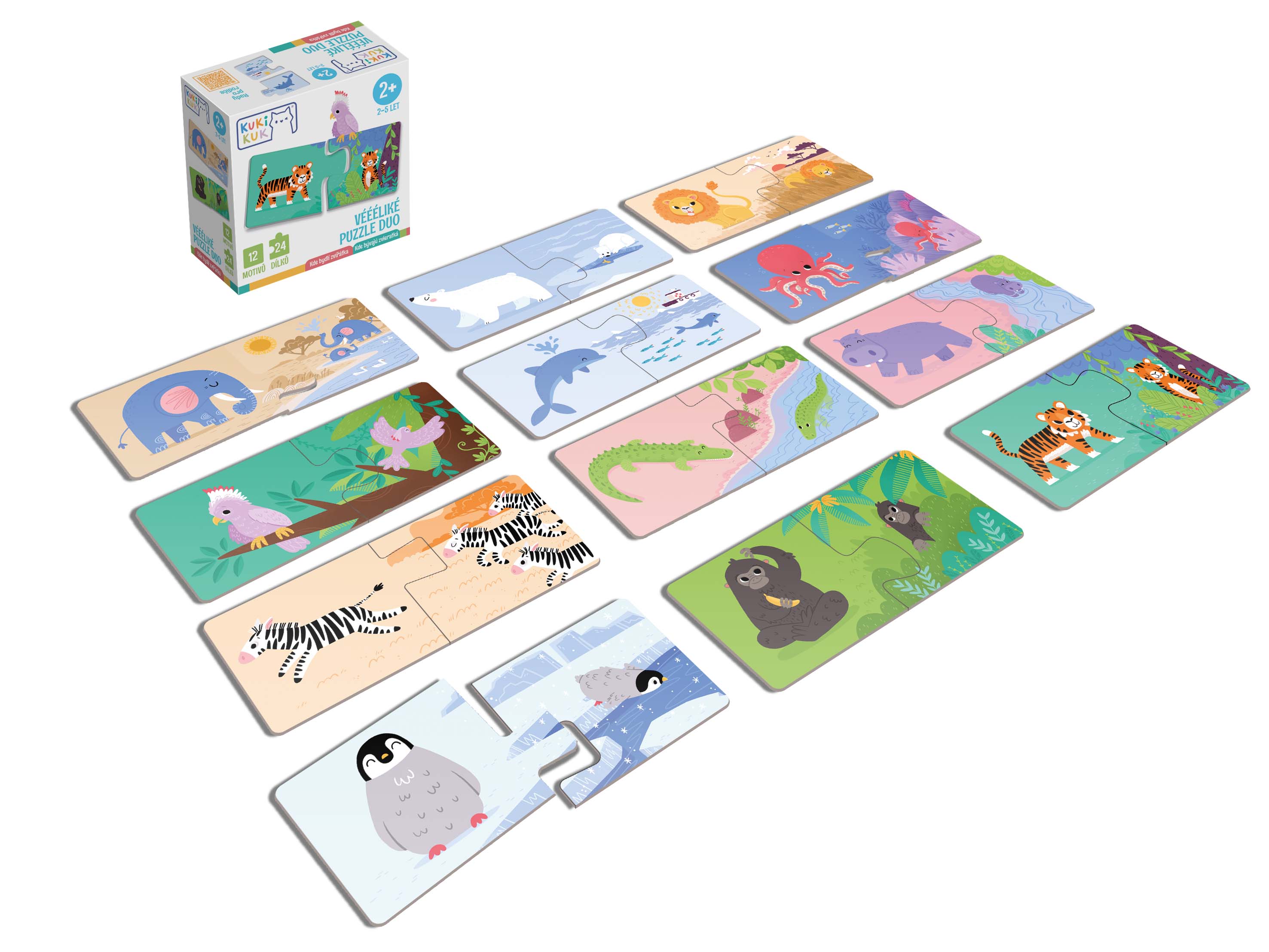 Originální puzzle se zvířátky z celého světa v jejich přirozeném prostředí. Obsahuje 12 motivů na 24 velkých puzzle dílcích z 2 mm silného kartonu. Hra přispívá k rozvoji jemné motoriky. Zajímavé tipy, jak dále využít kartičky k nenásilnému vzdělávání. Vyrobeno v ČR.