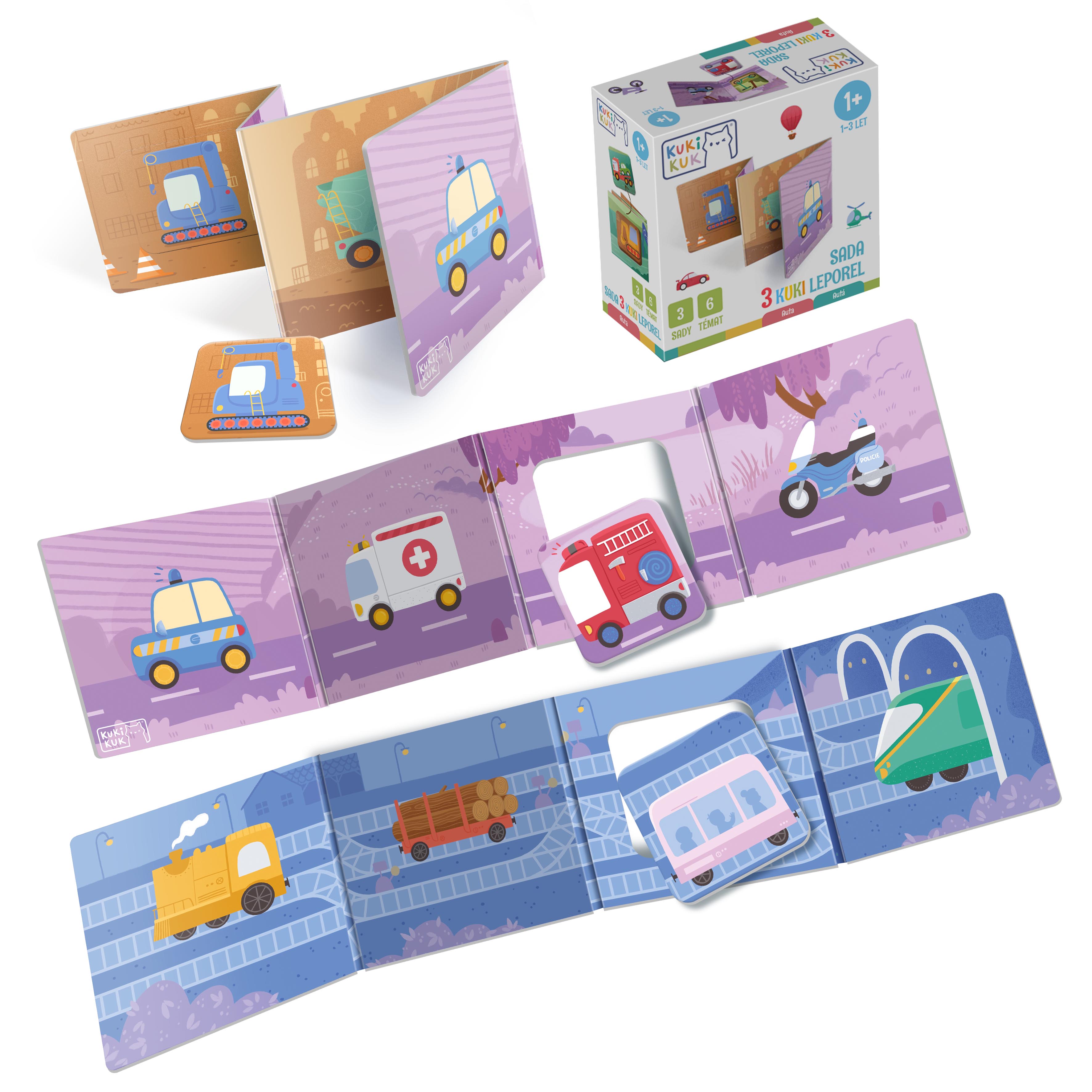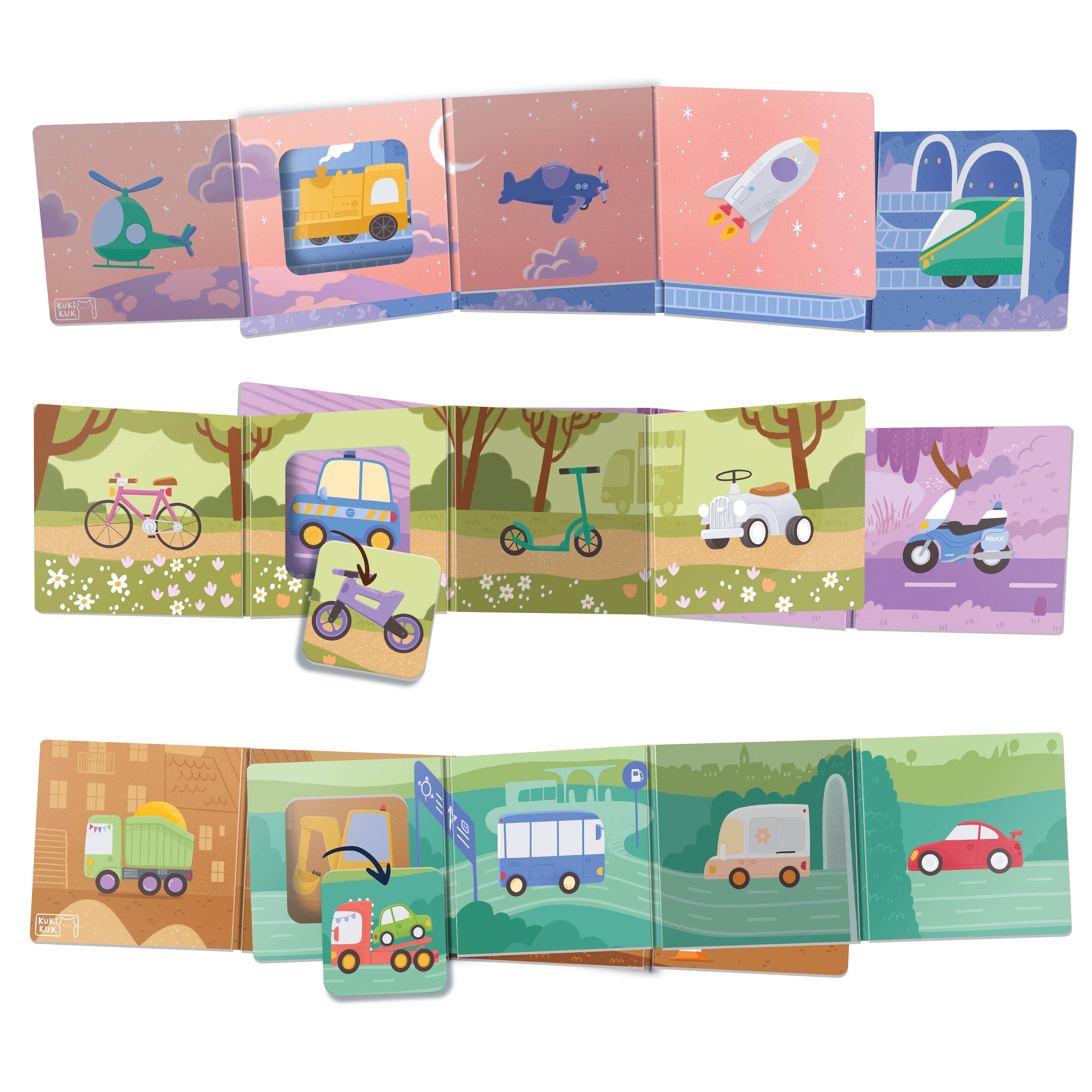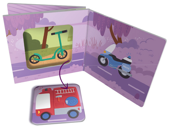 Tři oboustranná harmoniková leporela s okénky a čtvercovými vkládacími žetony. Na každém leporelu najdete čtyři vozidla vždy z jednoho tematického světa - staveniště, záchranáři, železnice atd. Celkem šest prostředí a 24 vozidel.