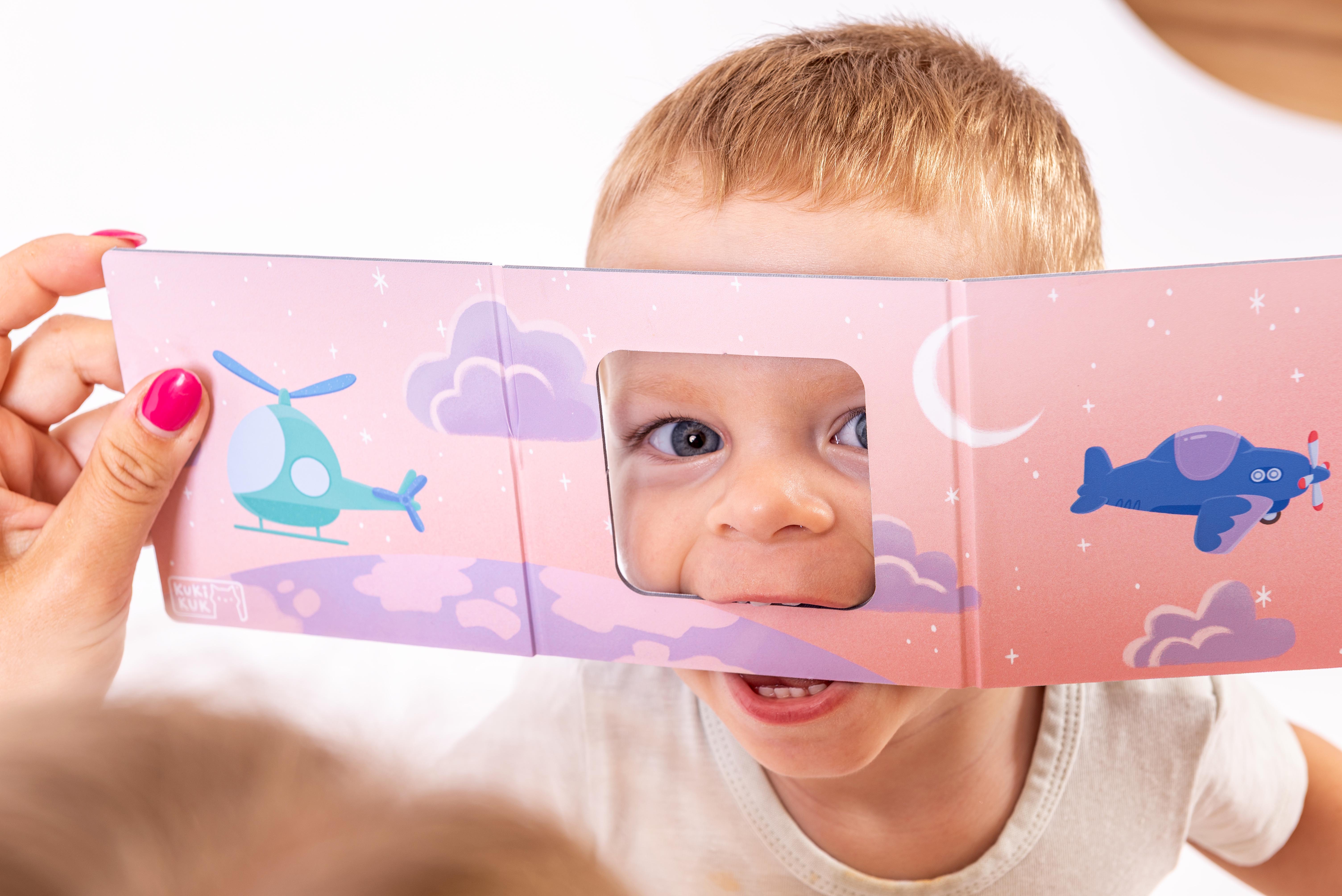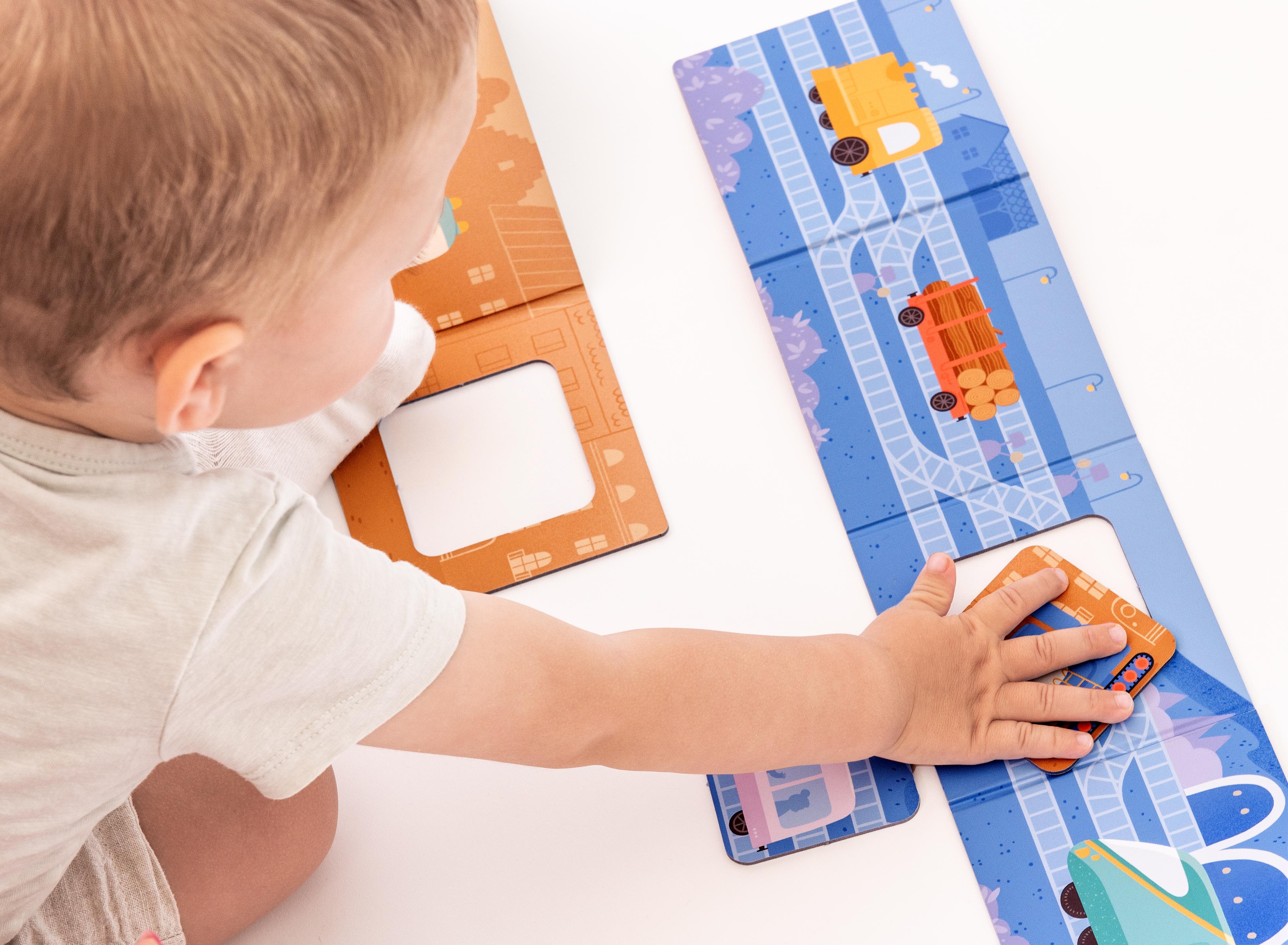 Vyprávějte dopravní příběh. Použijte leporelo jako kulisy. Auta, vlaky i motorky se potkávají, míří různými směry a něco zažívají. Okénkem sledujte, kdo projíždí na druhé straně.