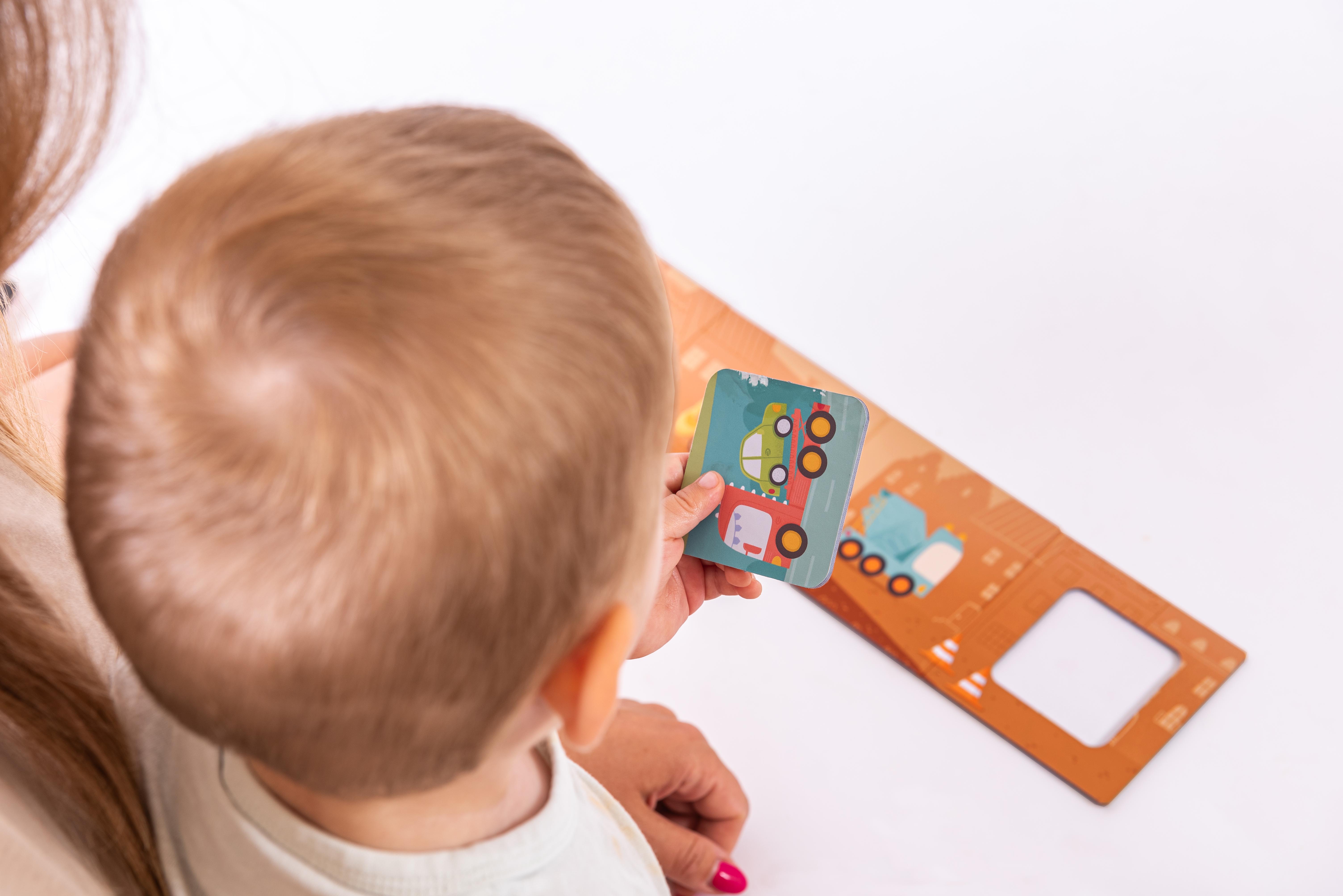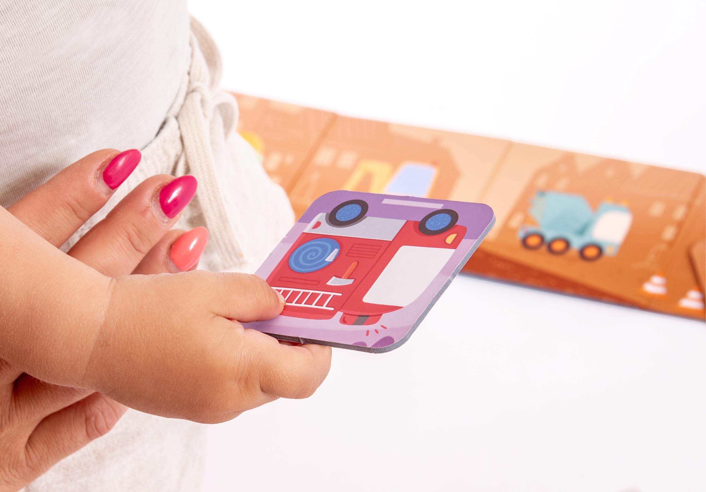 Najdi správné místo. Vyjměte třeba hasičský vůz nebo jeřáb a hledejte, kam patří: stavba, silnice, koleje? Pomáhejte otázkami: „Kde parkuje policejní auto?“ „Kam jede sanitka?“