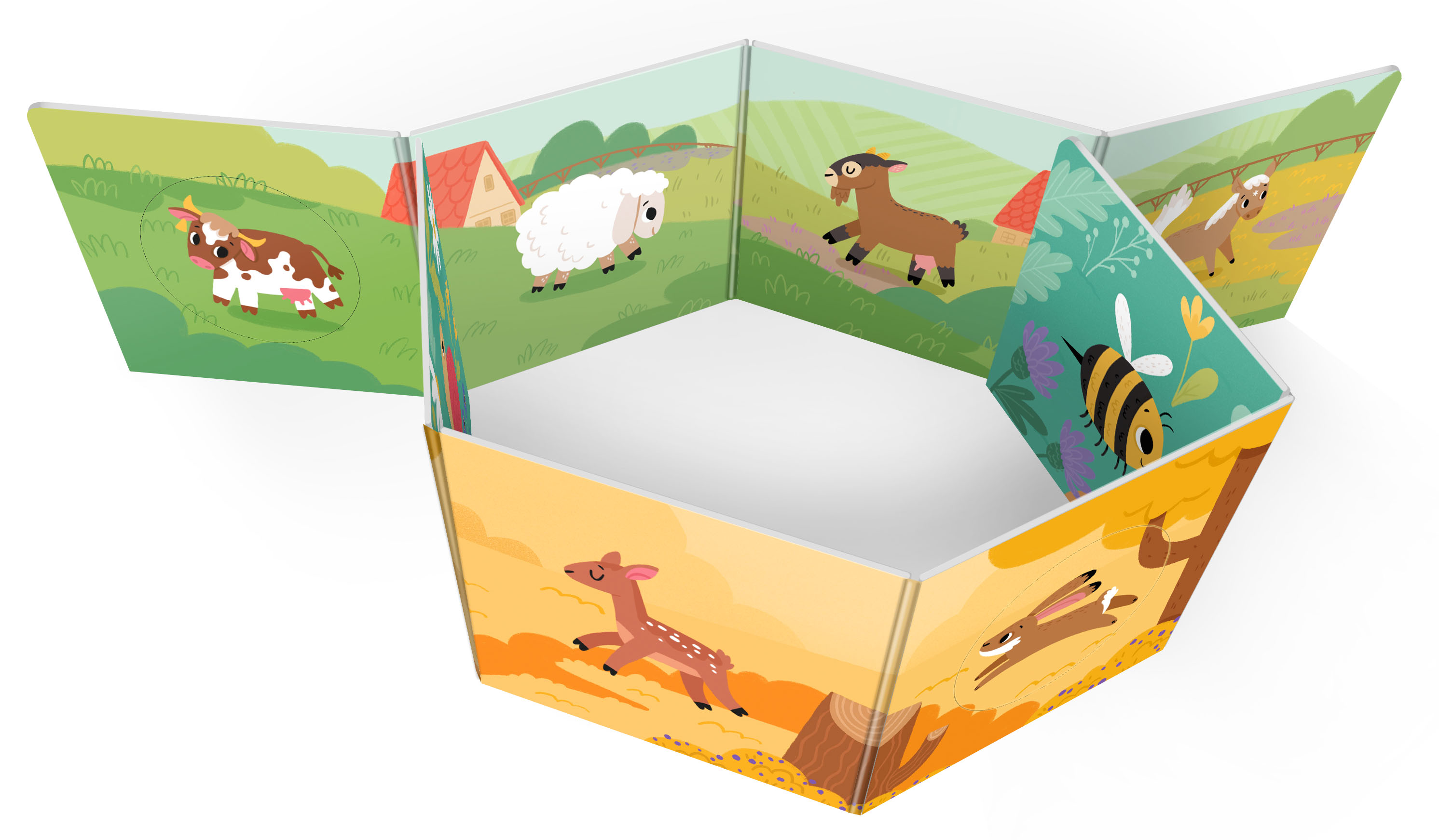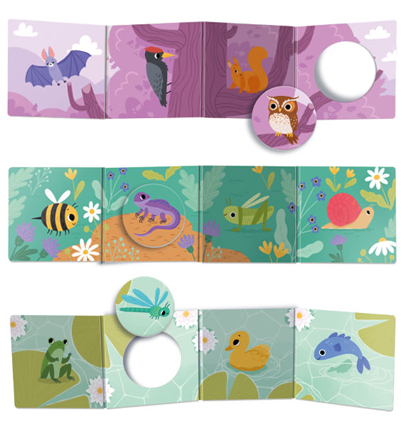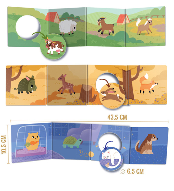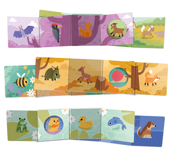 Tři oboustranná harmoniková leporela s okénky a kulatými vkládacími žetony. Každé leporelo se věnuje jinému prostředí - louka, les, pastvina atd. Zde najdete vždy 4 zvířátka; celkem šest prostředí a 24 zvířat.