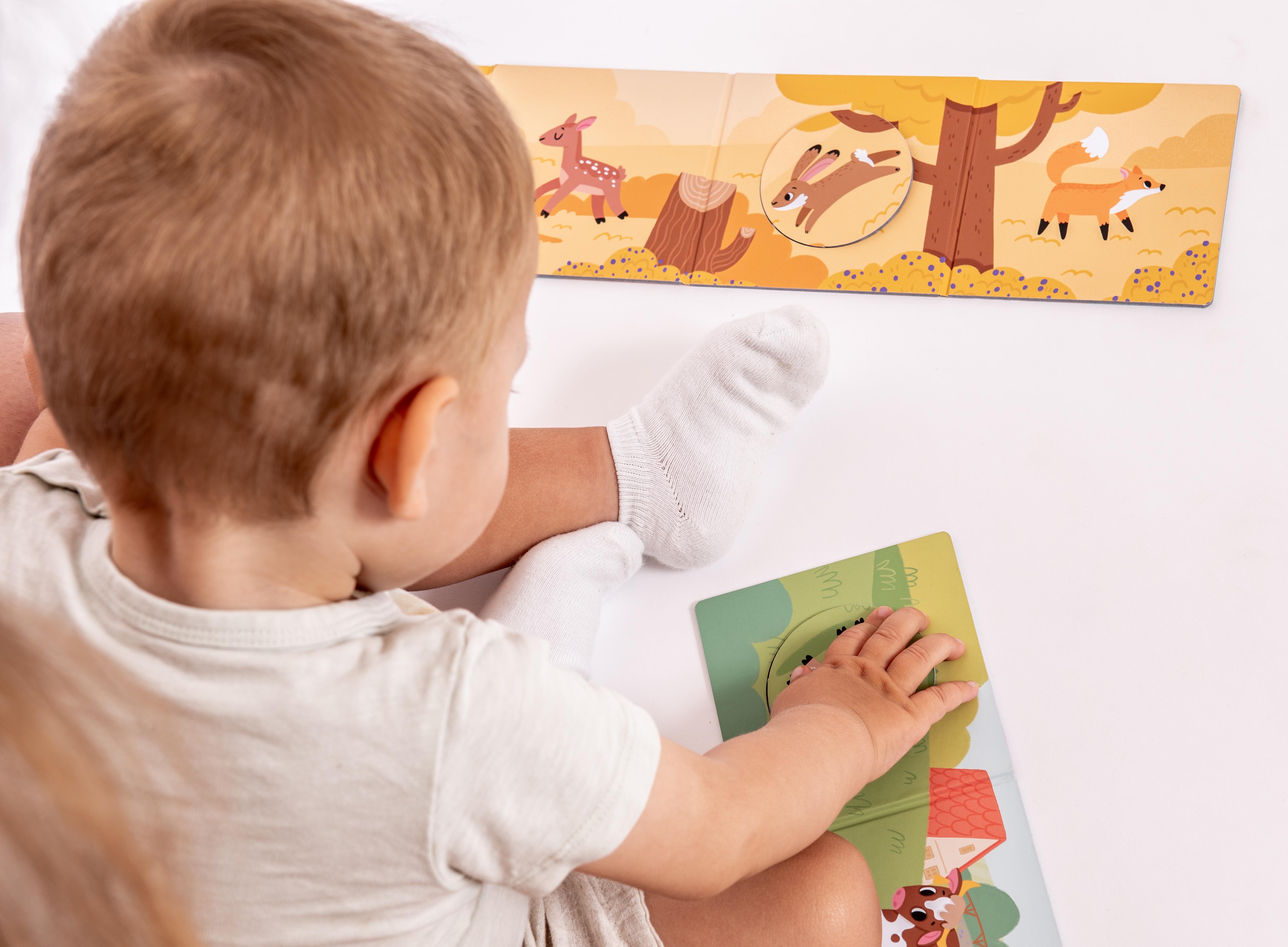 Děti nahlížejí výřezem, střídají zvířátka, přiřazují je ke správnému prostředí a vyprávějí vlastní příběhy. Díky různým kombinacím stránek vznikají nečekané průhledy a překvapení.