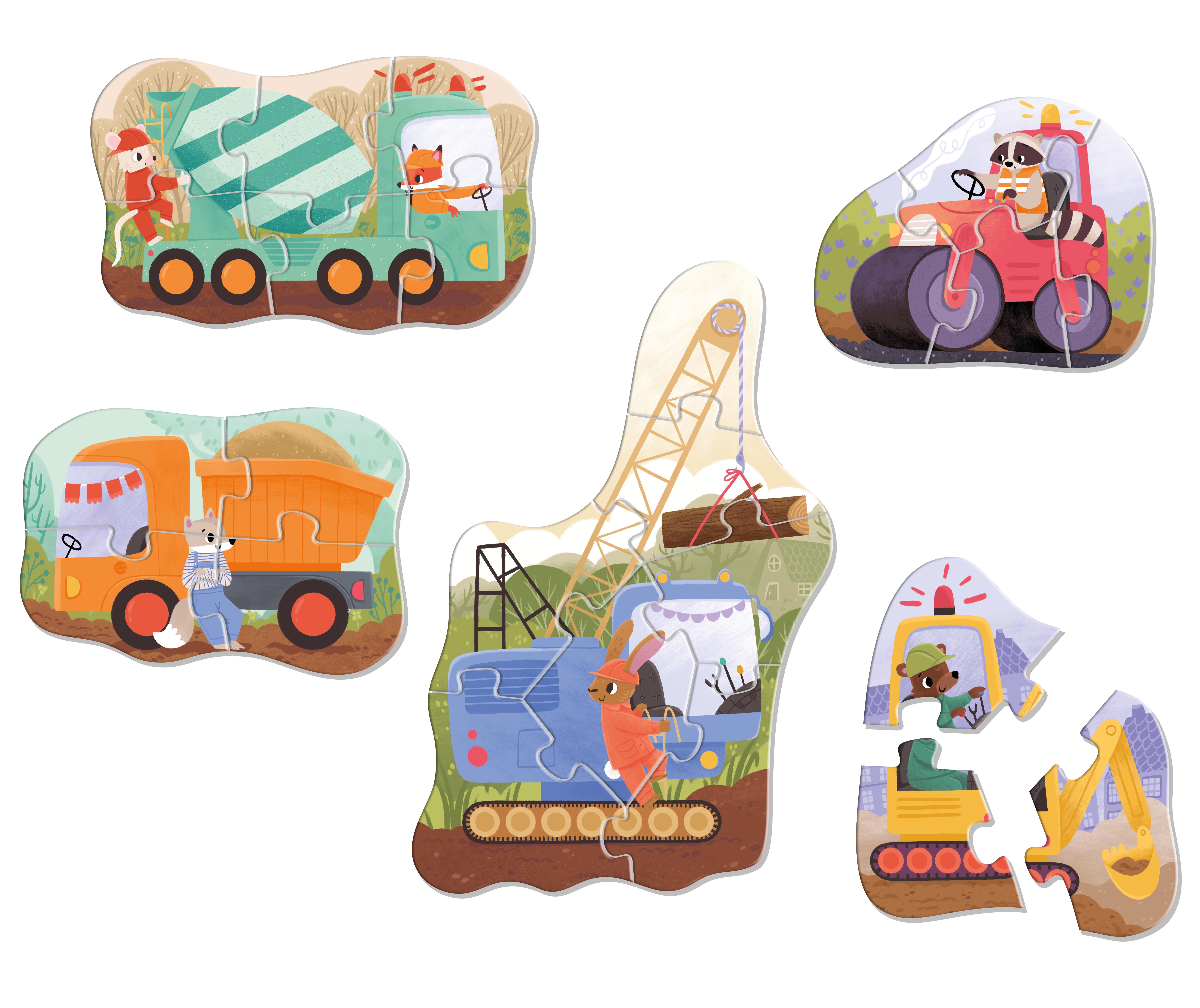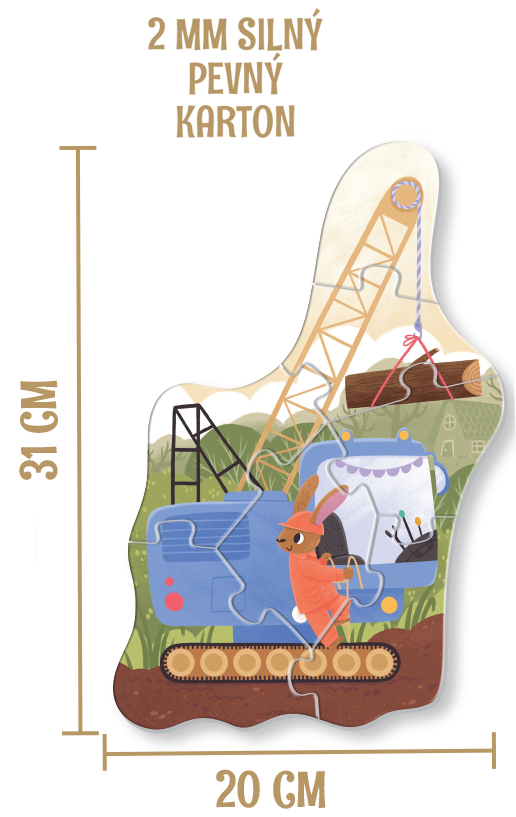 Veselé puzzle pro malé stavitele od 2 let. Malé děti si snadno poradí s extra velkými a 2 mm silnými pevnými dílky. Obsahuje 5 různých stavebních strojů – od jednoduchých dvoudílných po velké sedmidílné puzzle, které má rozměry 31 x 20 cm!