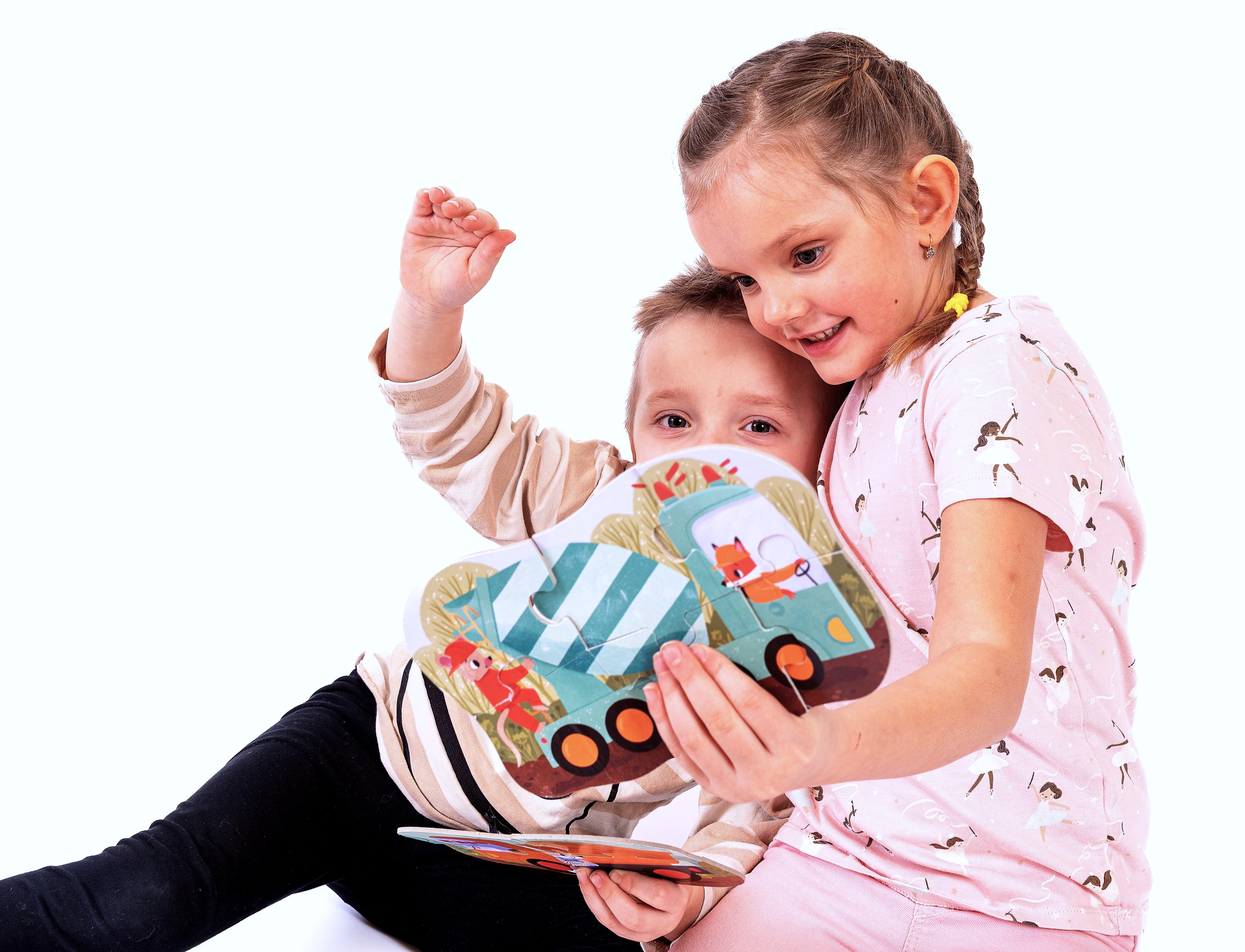 Kreativní rozšíření: Vezměte papír a pastelky – nakreslete stroje podle puzzle, vymyslete vlastní stavbu a další auta či bagry. Zkuste společně vyhledat informace o strojích a popsat, k čemu slouží.